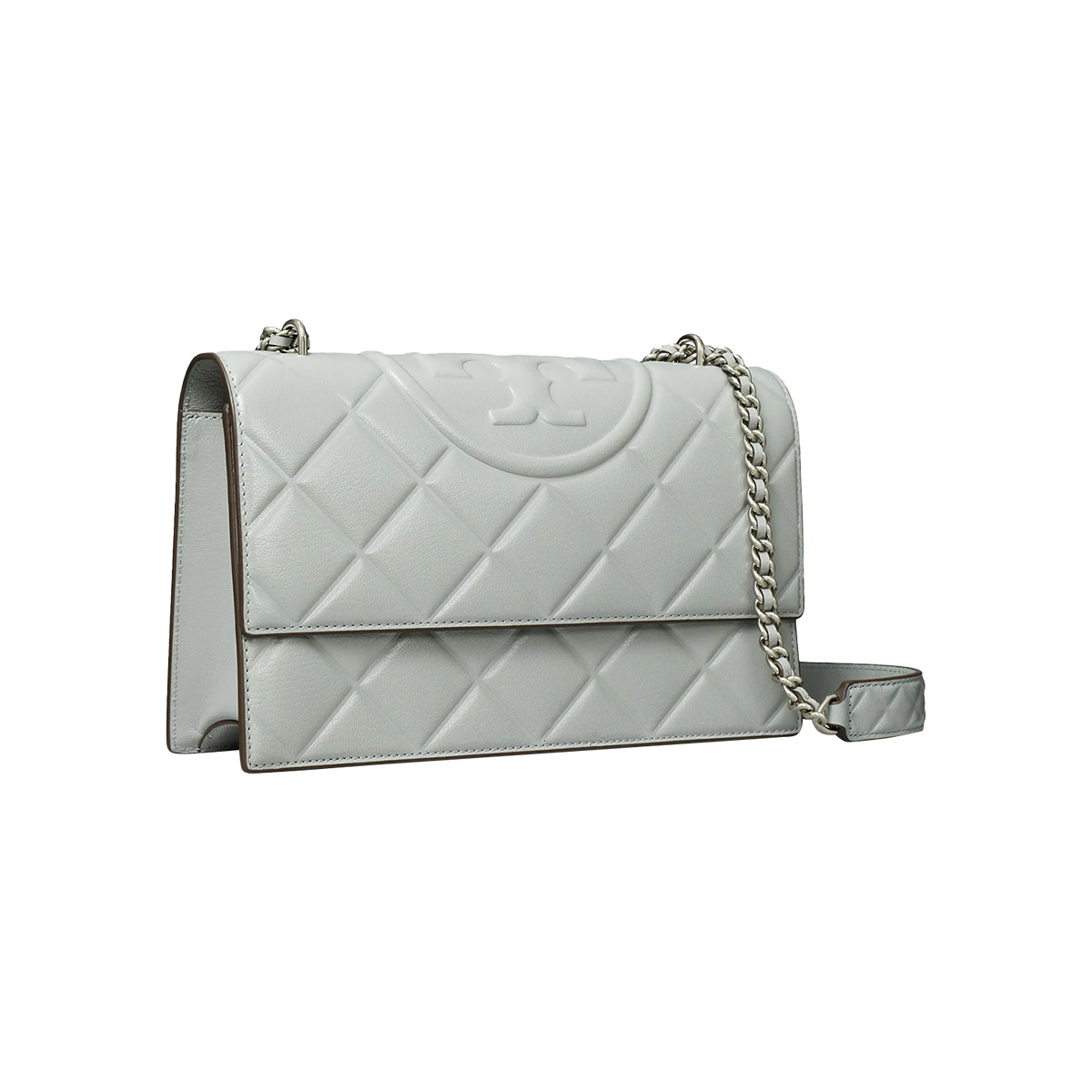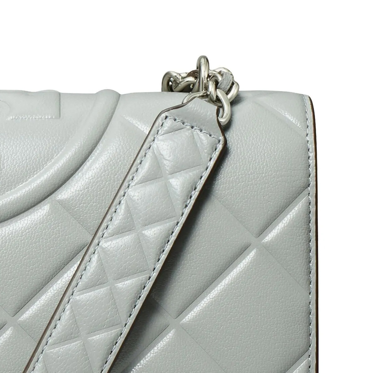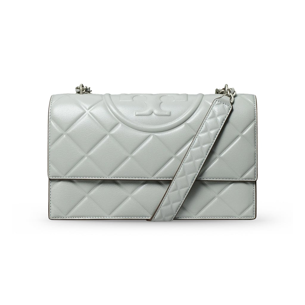 The Tory Burch Small Fleming Convertible Shoulder Bag (Gray / Grey variant) is crafted from Nappa leather with diamond-quilted panels, giving it texture and structure. The tone is a refined light grey, complemented by gold-tone hardware including the embossed Double T emblem.